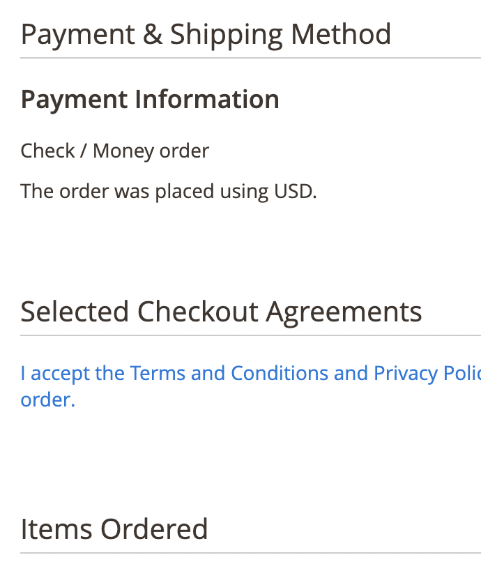 Podgląd zaznaczonych zgód przez użytkownika jest dostępny w panelu administratora na widoku konkretnego zamówienia w sekcji „Selected Checkout Agreements”: