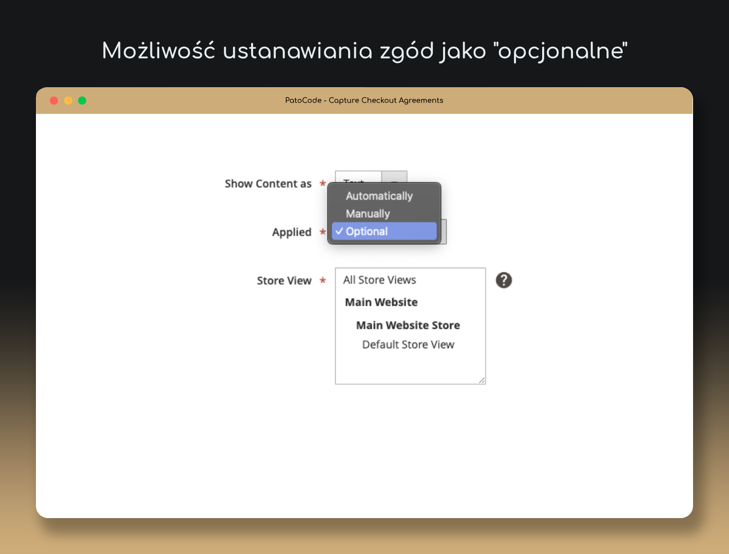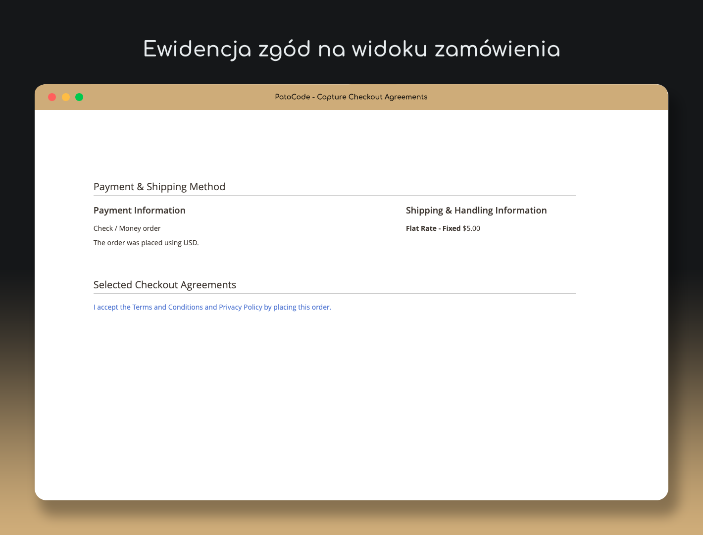 Dzięki intuicyjnemu interfejsowi, Capture Checkout Agreements integruje się bezproblemowo z Twoim sklepem, zapewniając większą przejrzystość i zgodność z wymaganiami prawnymi.